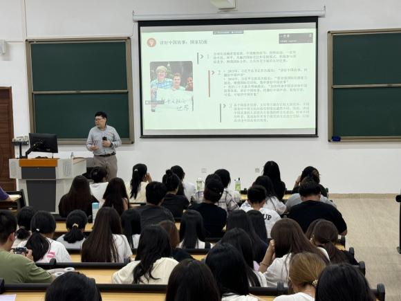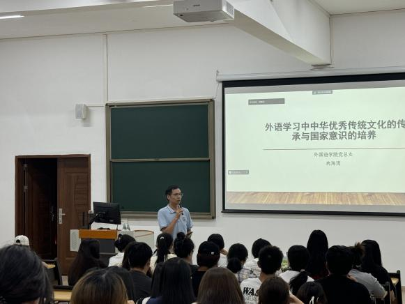 首先,冉书记以“外语学习中华优秀传统文化的传承与国家意识的培养”为主题,从党的二十届三中全会中的重要表述切入,引入外语讲述,贴合同学们所学的专业。随后,冉书记带领学子们了解时政常识、网络安全和文娱领域所反映的青年意识形态,与同学们一同思考学习语言的价值。此外,冉书记还从外语学生学习传承中华优秀传统文化的意义、外语学生的现状及外语学生应当培养国家意识三个方面,结合案例与经验为同学们讲述了作为新时代青年应如何讲好中国故事,说好红色故事,树立家国情怀,加强对家乡的认同,对身份的认同,对国家的认同,增强文化自信。最后,冉书记为同学们介绍了讲好当代中国故事的权威读本——《习近平谈治国理政》多语版,让同学们多了解学习,再传播中华文化,让中华优秀传统文化走出国门,走向世界!