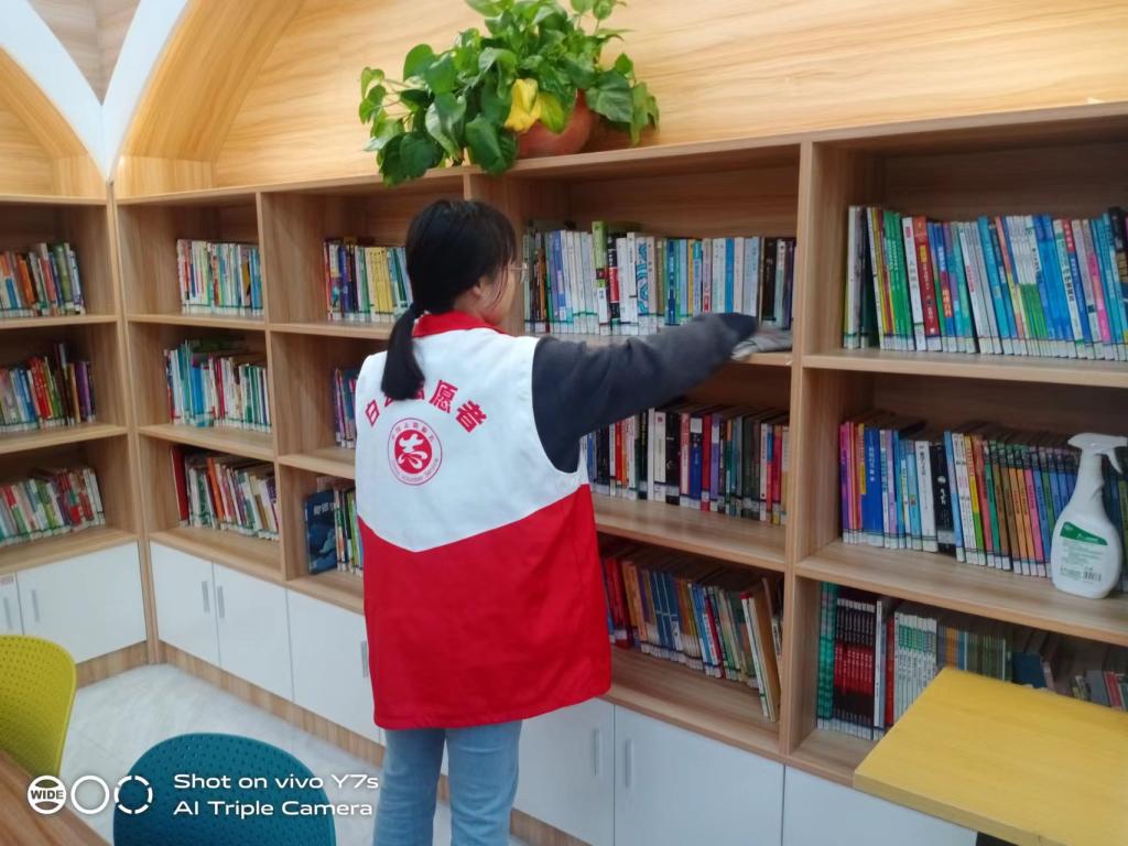 活动期间,穗丰村工作人员就图书馆的清扫整理区域进行工作分划,分发清扫工具,组织我院志愿者对图书馆各个角落的卫生进行处理。志愿者们身穿红马甲,手拿清扫工具,对图书馆内的书架表面灰尘进行了清理,并将书籍整理摆放整齐,清扫地面,擦拭桌椅,大家分工合作,积极配合,整体清洁工作开展的有条不絮。在我院志愿者集体努力下,图书馆的设施变得亮洁如新,书籍摆放得整整齐齐,面貌已然焕然一新。