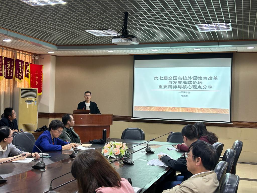 为学习第七届全国高等学校外语教育改革与发展高端论坛——“大道致远,知行合一”会议精神与核心观点,以党的二十大精神为指引,共探外语教育现代化建设新路径,共绘外语教育高质量发展新华章,122cc太阳集成游戏于3月30日下午在7-301召开学习分享会。122cc太阳集成游戏全体教职工参与学习。此次学习分享会由122cc太阳集成游戏党总支书记冉海涛主讲。