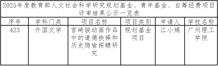 近日,教育部社会科学司正式发布《2025年度教育部人文社会科学研究一般项目评审结果公示》,122cc太阳集成游戏江小娟副教授申报的规划基金项目《宫崎骏动画作品中的道德抉择和历史隐喻探赜研究》在列其中。这是122cc太阳集成游戏首次获得教育部规划基金项目,实现了122cc太阳集成游戏在教育部人文社科项目立项方面零的突破。