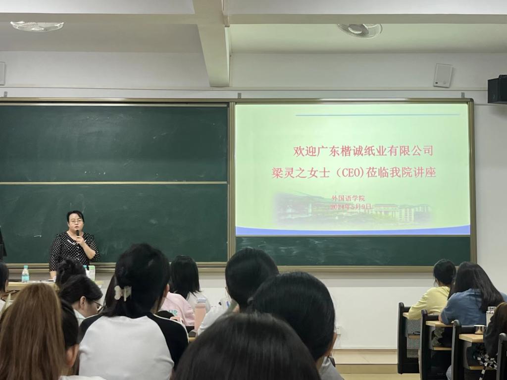 为加深学生对外贸行业的了解,拓宽学生对外贸人员基本商务能力的认知,引导学生扎实培养外贸行业基本能力。5月9日下午,我院邀请广东楷诚纸业有限公司的CEO梁灵之女士在7栋302教室开展了“浅谈外贸人员的商务能力及职业素养”讲座。我院部分学生参与。讲座由我院商务英语系主任郭琴主持。