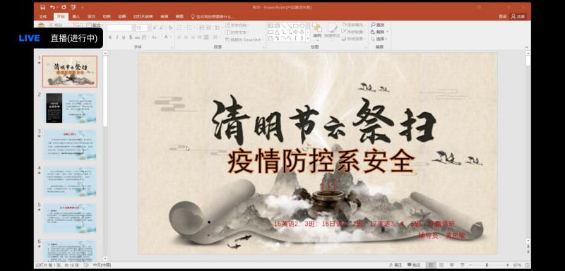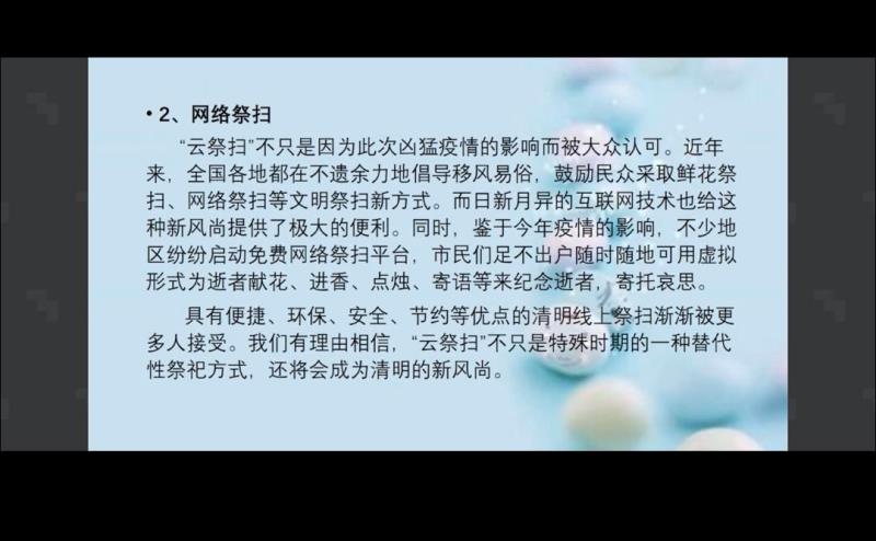 (通讯员:梁颖琪)2020年清明节的来临,受新冠肺炎疫情影响,4月3日下午,我院按照学校工作部署,结合实际,做出行动,突出重点、以云班会的方式,高效地开展了以“清明云祭承传统、疫情防控系安全”为主题的班会活动。