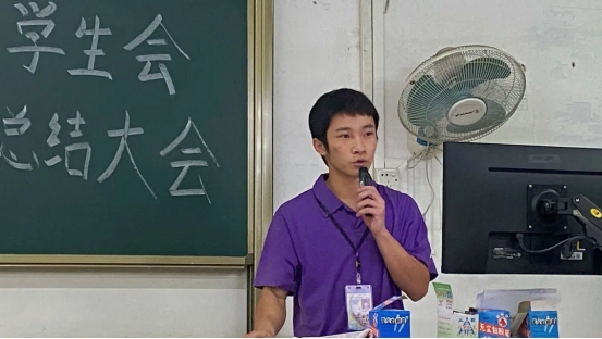 团总支组织委员兼学生会常务主席黄泳康作为主席团代表上台发言。他先跟大家分享了自己的学生会经历,提出应正确平衡团学工作与学习的关系。随后,他指出团学的工作应从整体出发,各部门之间以及部门内部要加强沟通交流,同时与上级领导以及其他兄弟学院也要保持密切联系。他例举了搬凳子这一工作所需要做的准备,指出团学工作需从多方面考虑。他希望团学成员们加入团学不仅仅是为了眼前的利益,更应该着力于提高自身素质和能力。最后,他向指导老师表示衷心的感谢,向一起留任的主席团以及大二副部表示极大的赞赏,并祝愿外国语团学越来越好!