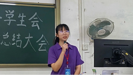 随后,秘书部大二副部董璐作为先进个人代表上台发言,她讲述了加入团学后的收获:通过工作她发现了自身的不足之处并从中反思,在一次次的活动中她锻炼了自己的能力。除此之外她还汲取了前辈的经验并不断创新本部门工作方式,提高部门的工作效率。最后她表示团学工作虽然比较繁忙,但也收获颇丰。