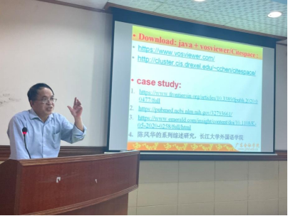 报告中,黄中习教授分享了一些常用的可视化分析工具,例如JAVA+CiteSpace、JAVA+VOSviewer、EXCEL图表等,认为这些工具可以辅助作者查阅、收集大量国内外近期相关文献,帮助作者理解、分析、归纳、整理写出文献综述,从而反映该专题的历史、现状、最新进展及发展趋势等情况。接着,黄教授以民族典籍翻译研究为例,从发文量、载文期刊、学科分布、高影响力作者、关键词以及专业术语等维度对民族典籍翻译的研究现状开展可视化计量分析。黄教授认为民族典籍的译介要逐步推进,可优先选择文化价值或生态价值较高的民族典籍进行译介,吸纳精通民族语言的本地译者和国外译者合作翻译,采取异质化的文化翻译策略与流畅的语言翻译策略相结合的翻译方法,通过多形式、多媒介推动民族典籍译作在译入语国家的传播和接受,促进民族典籍译作在译入语环境的生态生存和长存,从而有效传播中国多元民族文化。讲座激发了教师对民族翻译研究、民族文化对外传播研究的学术兴趣,对教师开展文献调研、了解学术前沿以及做好文献综述有重要指导意义,也给教师们申报项目、撰写论文提供了灵感与启发。