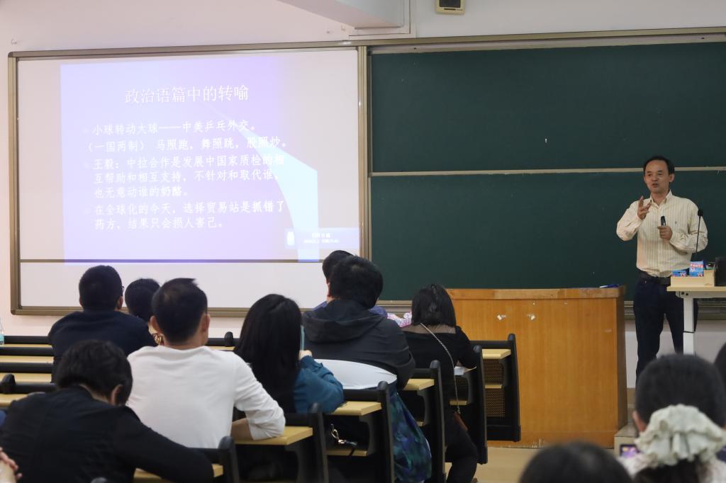 为促进学科建设,推动学术交流,4月27日下午,我院特邀广东外语外贸大学魏在江教授在7栋418教室开展题为“转喻的语法效应”的学术讲座。讲座由122cc太阳集成游戏党总支书记冉海涛主持,122cc太阳集成游戏全体专任教师及学生代表参加。