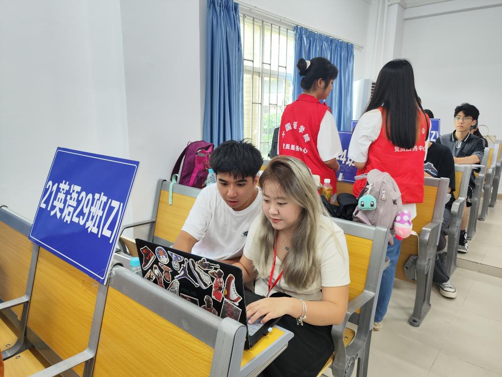 在报到现场,老师们各司其职。王丽芳、许娟娟老师等和志愿者们有序引导新生们扫码。在宿舍分配组,张英坤老师、卫一老师和罗晓怡老师等仔细地为新生们完成宿舍分配。蔡书记则帮助同学们开通绿色通道,以便同学们顺利报到。面对新生和家长的疑问,志愿者们耐心解答,积极引导。即使烈日当空,仍阻挡不了志愿者们的迎新热情。