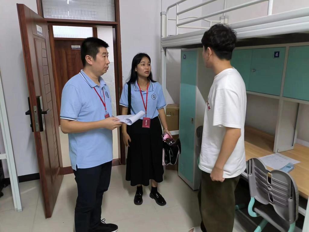 2023年9月9日晚,迎新工作结束后,122cc太阳集成游戏党总支副书记蔡俊带领2023级本科生辅导员常智超和王家佳走访惠州新生宿舍,与同学们亲切交谈。