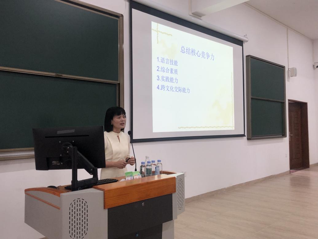 随后,涂兵兰教授告诉大家,英语专业核心竞争力包括语言能力、跨文化交际能力、专业知识和应用能力等方面。这些核心竞争力将直接影响学生未来的职业发展以及国际交流能力等,同时分享了两个提升英语专业核心竞争力的策略。首先是语言能力的培养,她指出,语言是英语专业的基石,学生们需要通过大量的阅读、写作、听力和口语练习来提升自己的语言能力。此外,她还强调了跨学科、跨专业的重要性。针对大一新生对未来的迷茫,提出专业+英语、英语+专业、互联网+等学习模式和理念,鼓励学生们拓展专业学习和思维模式,全面发展,拓宽就业渠道。