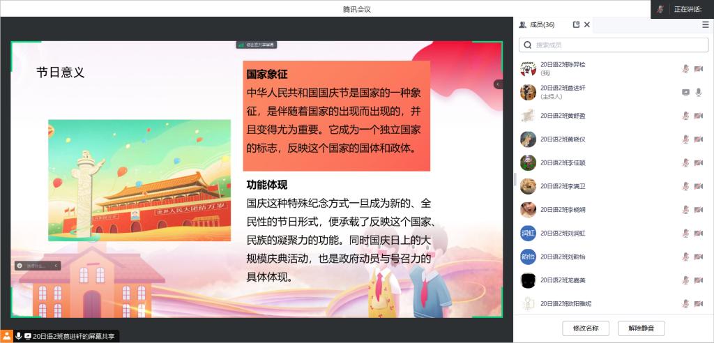 中秋国庆假期结束,为进一步弘扬爱国主义精神,引导学生收心归位鼓干劲、凝心聚力再出发,我院于10月6日晚上,组织召开“国庆爱国教育及假期返校温馨提示”主题班会。本次班会线上线下同时进行,全体同学共同参加。