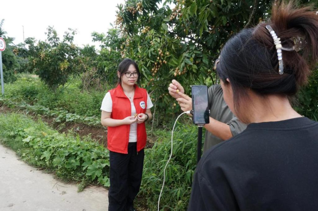 7月13日,在钱东镇乡村振兴志愿者黄钿钿的带领下,团队首站来到礼堂村。村委干部陈同志热情接待并详细介绍了黄皮果产业发展现状。通过实地走访果园、与农户深入交流,队员们全面掌握了黄皮果从种植到销售的全链条信息。在此基础上,实践团拍摄了黄皮果中英文推介视频。队长吴禅玲担纲主讲,将镜头对准这片充满希望的果园,结合实地调研的所见所闻,用清晰流畅的语言介绍礼堂村黄皮果的特色、品质、营养价值及背后的乡村故事,为乡村特色农产品“走出去”贡献力量。