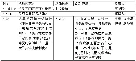以邓小平理论和“三个代表”重要思想为指导,深入落实科学发展观,认真贯彻党的十七大和十七届四中全会精神,以“加强制度建设,构筑拒腐防线”为主题,加强对系部党员干部的反腐倡廉教育,重点抓好反腐倡廉党纪法规制度教育,同时抓好师生员工的廉洁教育,营造风清气正的育人环境,为学校的改革发展稳定提供坚强的政治思想保障。