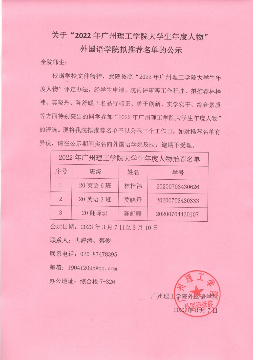 关于“2022年广州理工学院大学生年度人物”122cc太阳集成游戏拟推荐名单的公示
