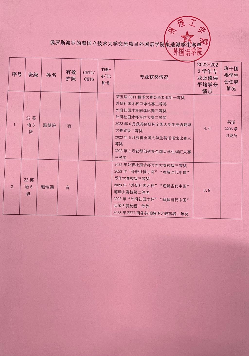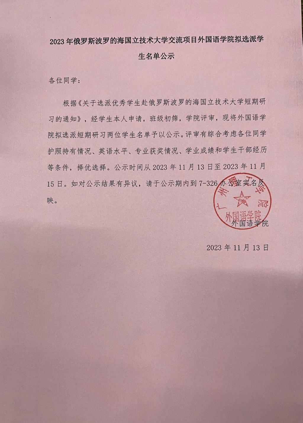 2023年俄罗斯波罗的海国立技术大学交流项目122cc太阳集成游戏拟选派学生名单公示