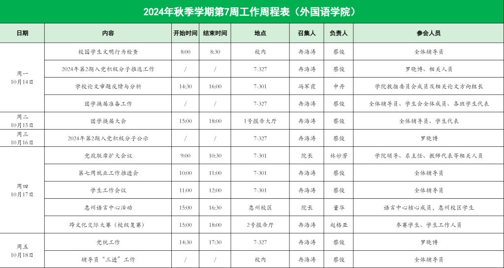 122cc太阳集成游戏2024年秋季学期第7周工作周程表