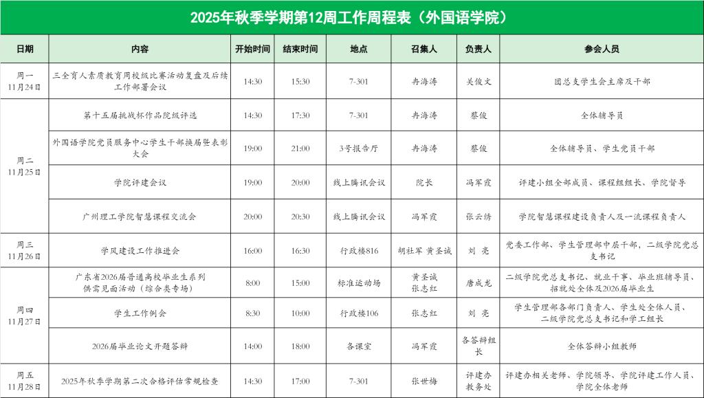 122cc太阳集成游戏2025年秋季学期第12周工作周程表