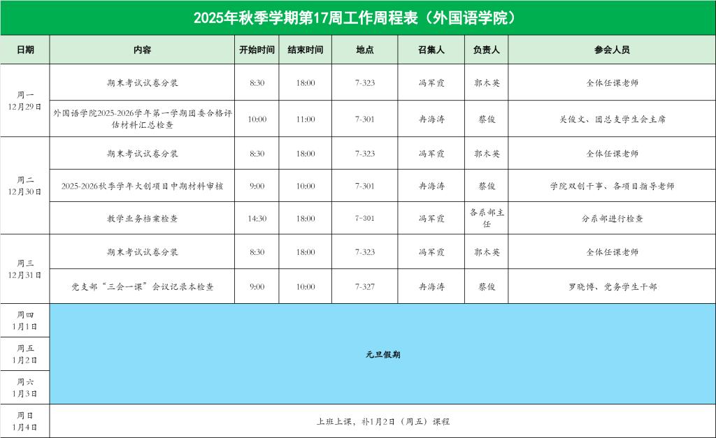 122cc太阳集成游戏2025年秋季学期第17周工作周程表