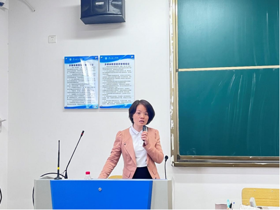 紧接着,郭木英老师主持开展期末考务工作培训会。她通过介绍制卷相关要求、监考流程及注意事项等,向各位老师提出了制卷的基本要求和试卷整理提交的要求,并通过列举在制卷中出现过的问题,提醒各位老师在制卷时要严格按照要求,认真细心。随后,她对阅卷点基本要求进行了详细地介绍,并对监考流程进行了梳理,特别强调应努力把握作弊行为的相关证据以及要在试卷清点工作完成后才能让学生离开教室。