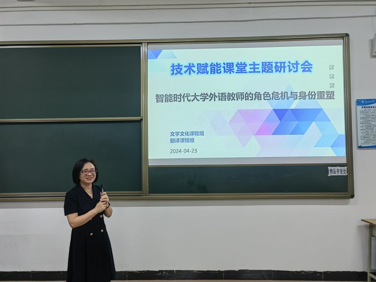 4月23日上午,一场以“技术赋能课堂——智能时代大学外语教师的角色危机与身份重塑”为主题的研讨会在6栋109教室举行。本次研讨会由文化文学课程组与翻译组联合举办,旨在探讨超星、AI等现代技术在教学领域的应用,如何更好地提升教学质量和效率。文化文学课程组与翻译组全体教师参与。本次会议由潘宏妍主任主持。