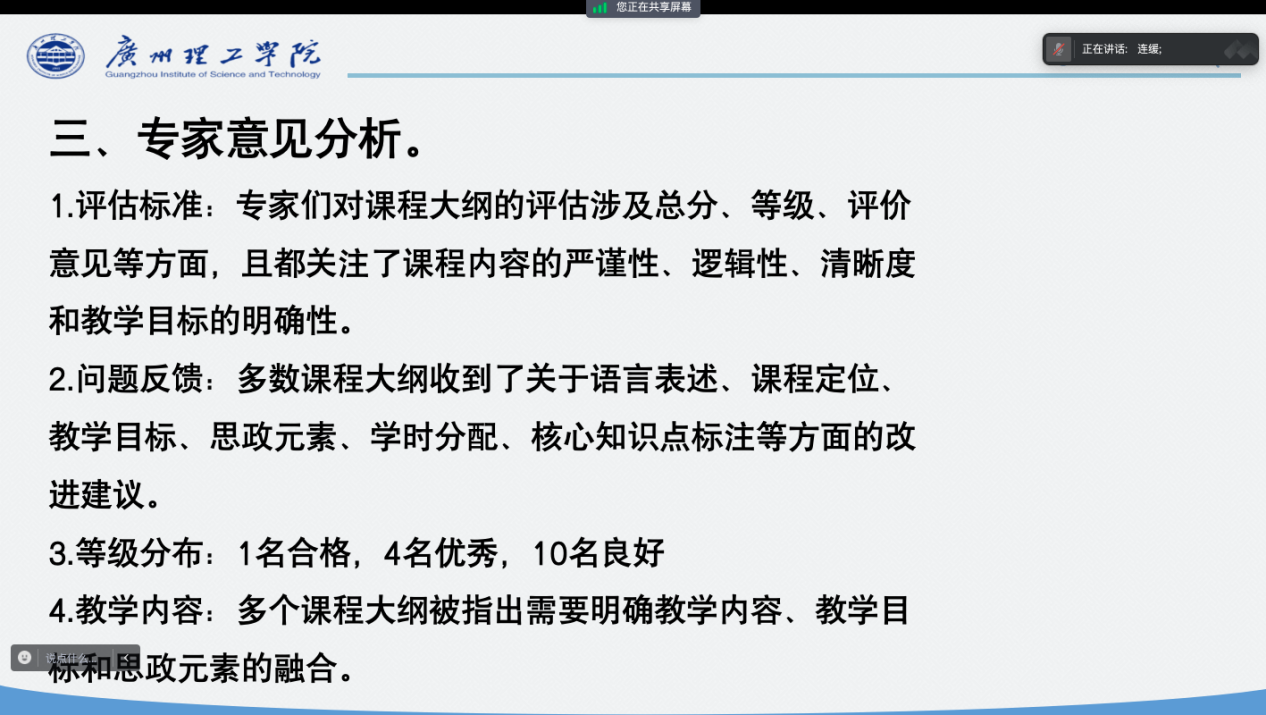 最后,冯院根据专家反馈的意见进行了总结。她从评估标准、问题反馈、等级分布、教学内容这几个方面和各位老师进行了分享。她强调修订教学大纲是一项长期而艰巨的任务,需要全体教师的共同努力和持续探索,希望大家能够以此次会议为契机,进一步加强交流与合作,共同推动学院教学质量的提升。