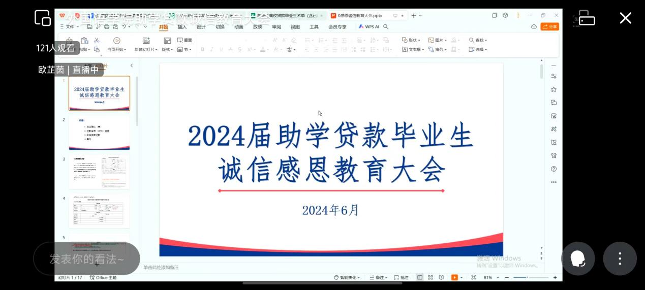 最后,欧芷茵老师通过向毕业生普及征信知识、贷款违约产生的严重后果,帮助同学们牢固树立诚信观念和法治意识,警示同学们珍视信用记录,按期偿还贷款本息。