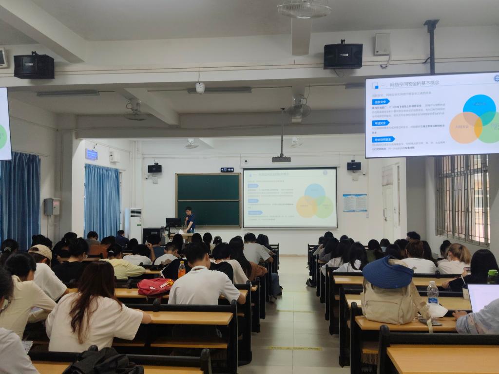 讲座伊始,曾祥斌首先介绍了网络安全的基本概念,深入浅出地讲解了网络安全的重要性及其在现代社会中的应用,帮助同学们明晰网络空间面临的各类潜在威胁与防护要点。曾祥斌通过举例子如网络勒索,AI诈骗等,警醒同学们不能轻信网上信息。他强调,随着信息技术的快速发展,网络安全已成为国家安全的重要组成部分,保护个人信息和数据安全显得尤为重要。