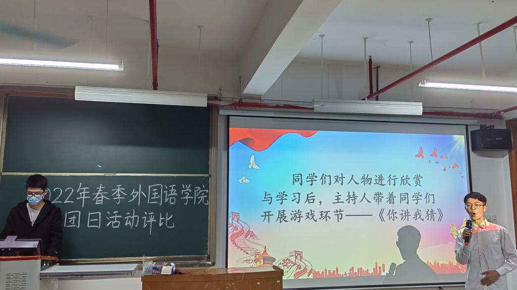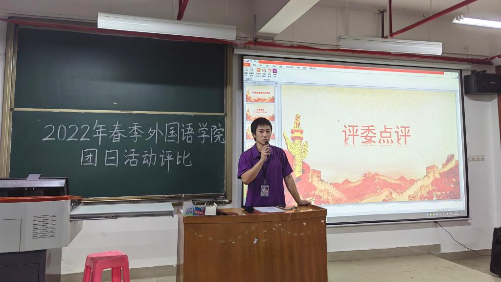 团总支组织委员黄泳康点评本场比赛。他指出,我们应该着重关注主题部分,提倡用英语结合党史的知识一起讲解,丰富内涵,也可以结合我校具体情况,贴近生活实际;希望广大青年勇担时代使命,不负青春韶华。